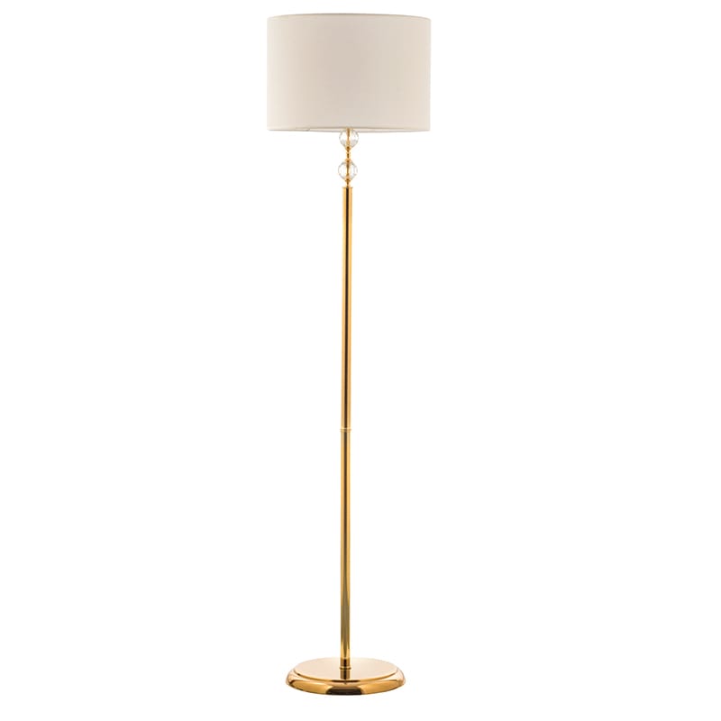 Πρόκειται για ένα χρυσό μεταλλικό επιδαπέδιο φωτιστικό με λευκό υφασμάτινο καπέλο.