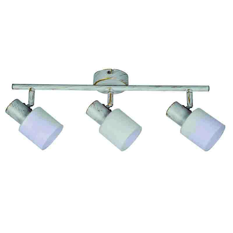 Πρόκειται για ένα μεταλλικό σποτ σε απόχρωση λευκής πατίνας με τρεις λαμπτήρες.