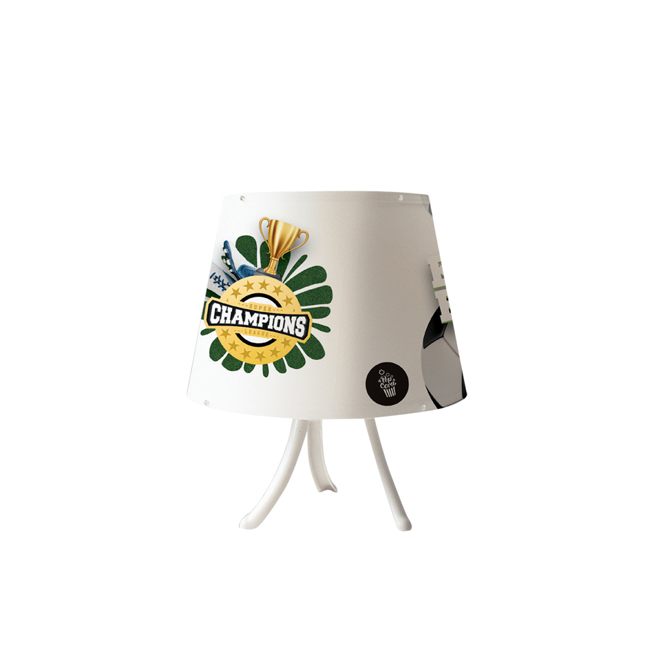 Πρόκειται για ένα επιτραπέζιο παιδικό φωτιστικό από μέταλλο σε λευκή απόχρωση με πολύχρωμο καπέλο.