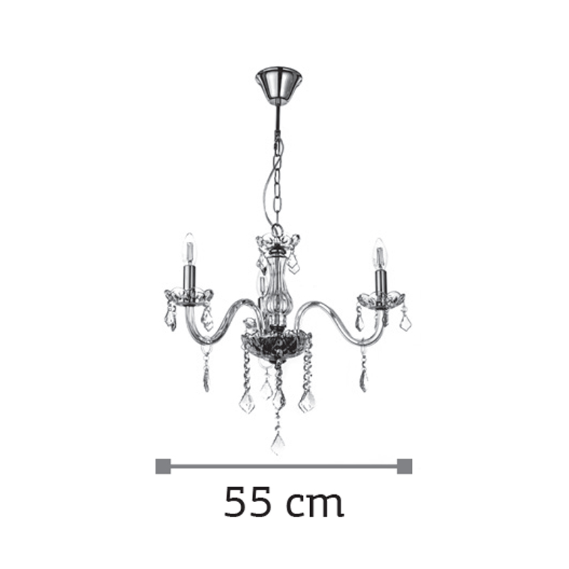 Πρόκειται για ένα διάφανο γυάλινο κρεμαστό φωτιστικό με τρεις λαμπτήρες. Τόσο τα διάφανα κρύσταλλα που κρέμονται όσο και οι χρώμιο μεταλλικές λεπτομέρειες του προσδίδουν μια επιπλέον λάμψη. Η χρώμιο μεταλλική ανάρτηση είναι ρυθμιζόμενη και προσαρμόζεται στον κάθε χώρο.