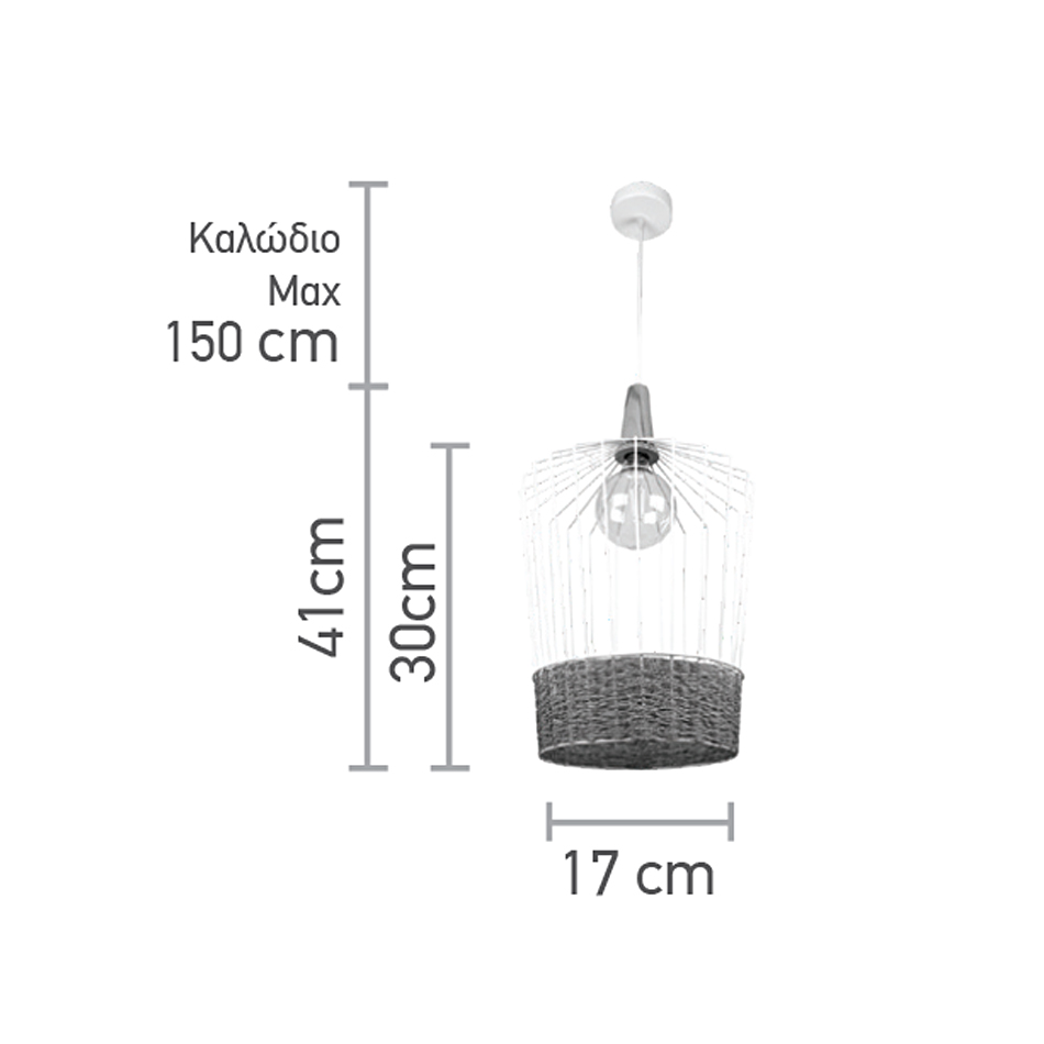 Κρεμαστό φωτιστικό από λευκό μέταλλο, σχοινί και ξύλο 1XE27 D:17cm (4026-Β)