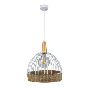 Κρεμαστό φωτιστικό από λευκό μέταλλο, σχοινί και ξύλο 1XE27 D:26cm (4026-Α)