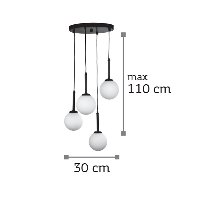Πρόκειται για ένα μαύρο μεταλλικό φωτιστικό με λευκή οπαλίνα και τέσσερις λαμπτήρες.