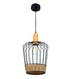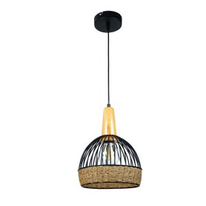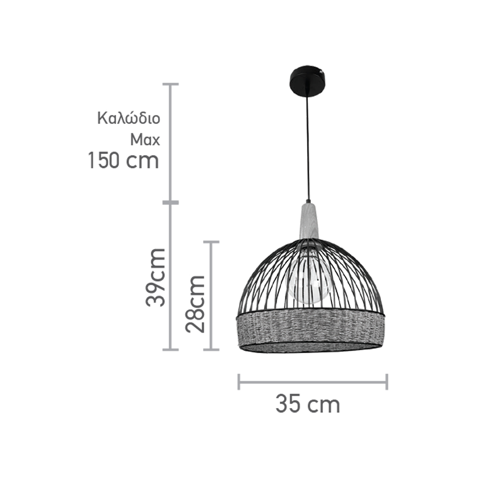 Κρεμαστό φωτιστικό από μαύρο μέταλλο, σχοινί και ξύλο 1XE27 D:35cm (4027-Α)