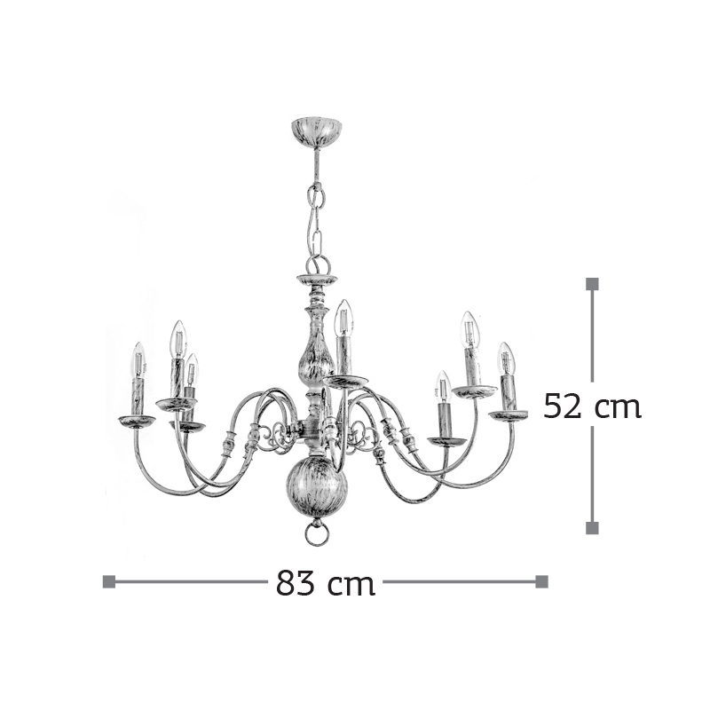 Πρόκειται για ένα κρεμαστό φωτιστικό από μέταλλο σε λευκή πατίνα με οχτώ λαμπτήρες.