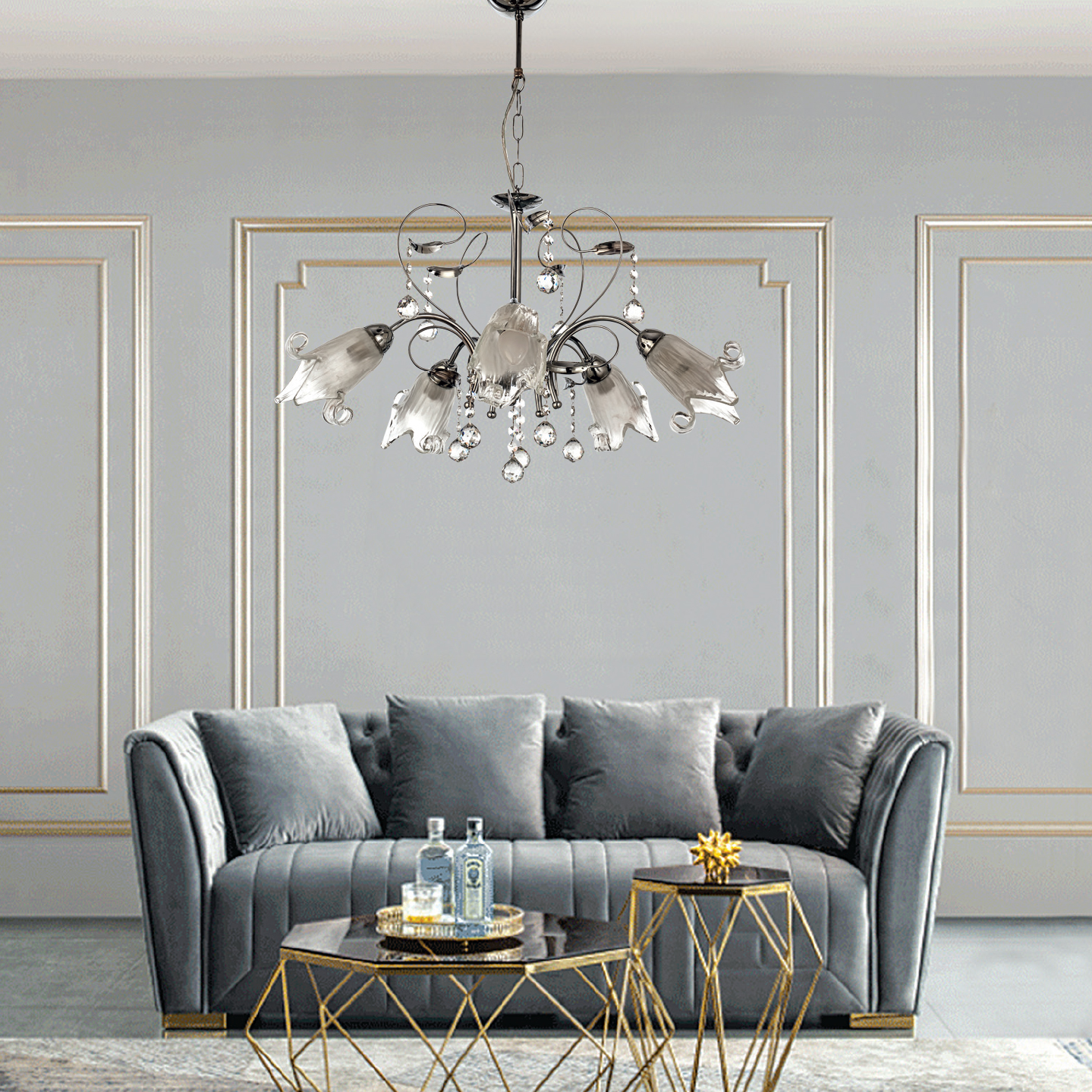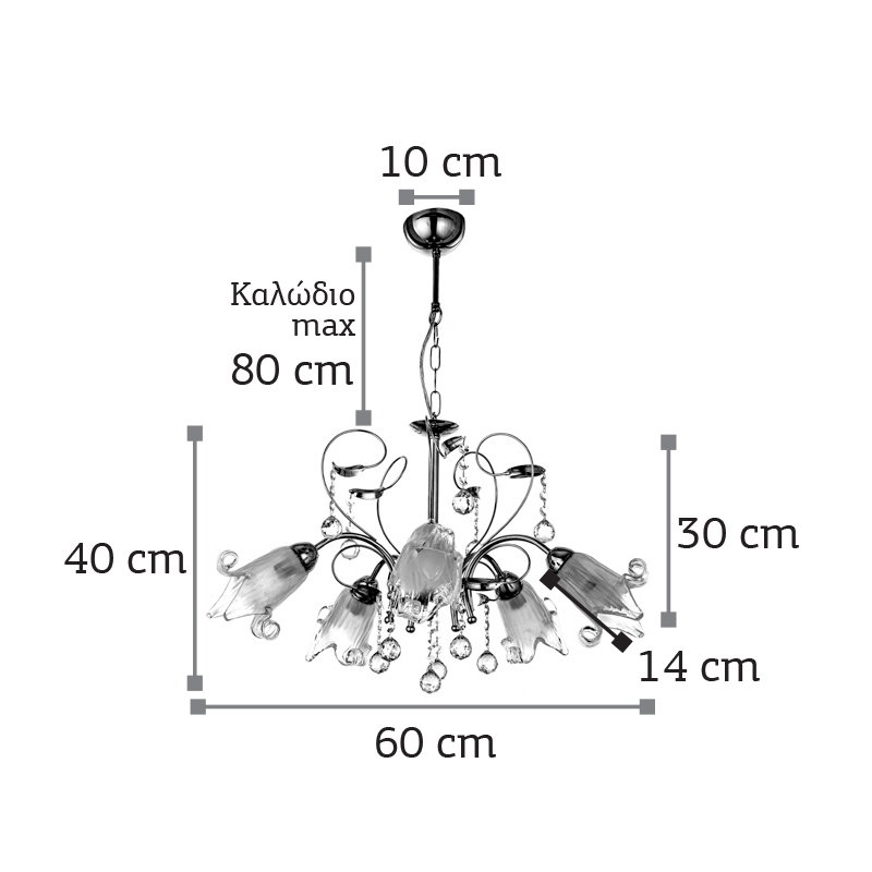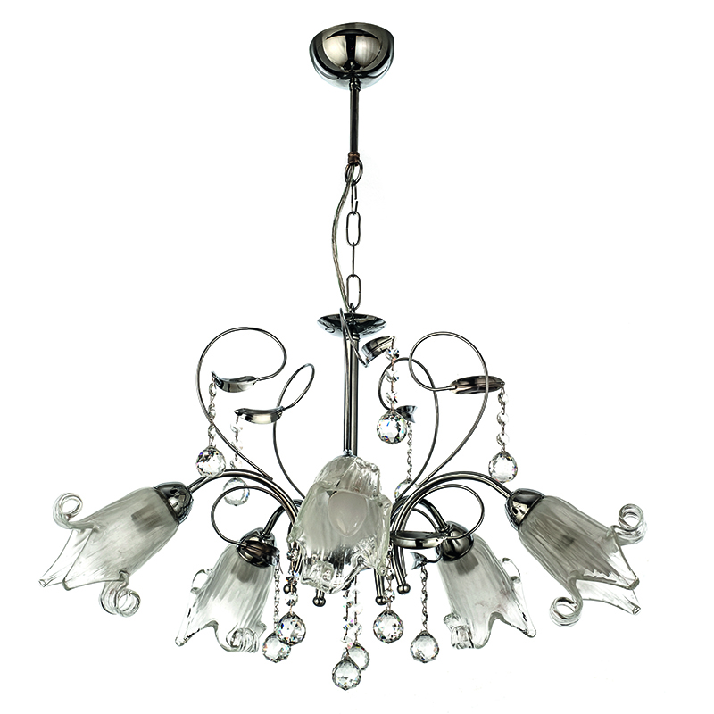 Πρόκειται για ένα κρεμαστό φωτιστικό από χρώμιο μέταλλο και πέντε λαμπτήρες.