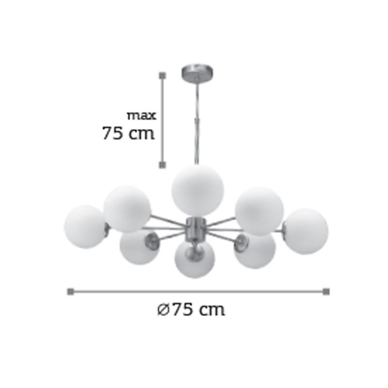 Πρόκειται για ένα χρυσό ματ μεταλλικό φωτιστικό με λευκή οπαλίνα στο τελείωμα και οκτώ λαμπτήρες.