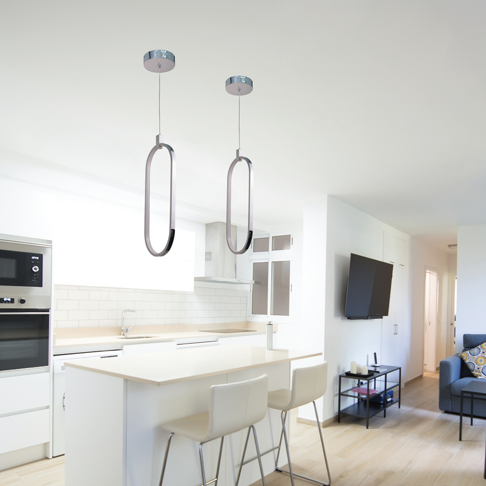 Πρόκειται για ένα χρώμιο μεταλλικό κρεμαστό φωτιστικό μίνιμαλ σχεδίασης. Η λευκή ακρυλική του επιφάνεια καλύπτει τον LED φωτισμό θερμής απόδοσης.