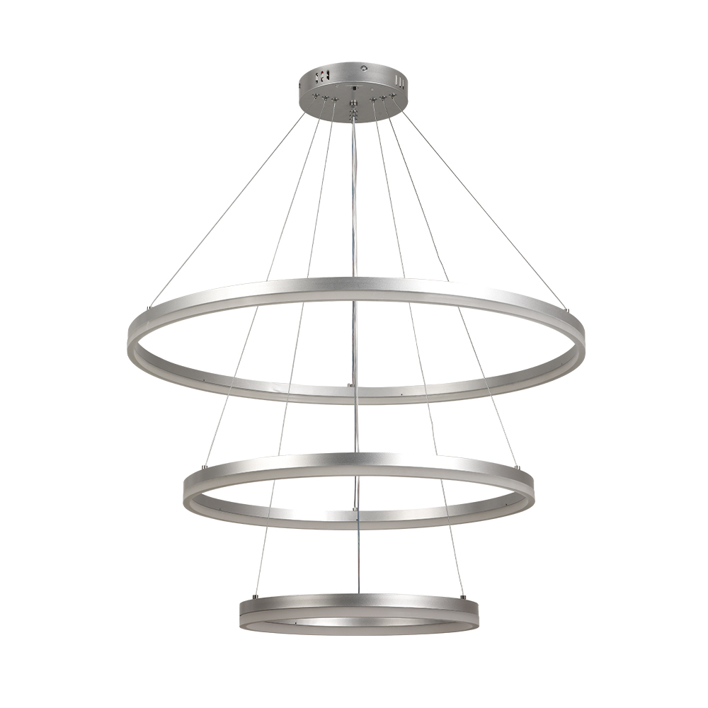 Κρεμαστό φωτιστικό LED 100W σε ασημί απόχρωση με επιλογή απόχρωσης φωτισμού απο διακόπτη που βρίσκεται στην βάση του φωτιστικού (3CCT by switch on base) .Το προϊόν παρέχεται με 2 επιλογές τοποθέτησης .Το προϊόν ντιμάρεται απο απλό διακόπτη τοίχου με εναλλαγή στο πάτημα (3 step dimmable)